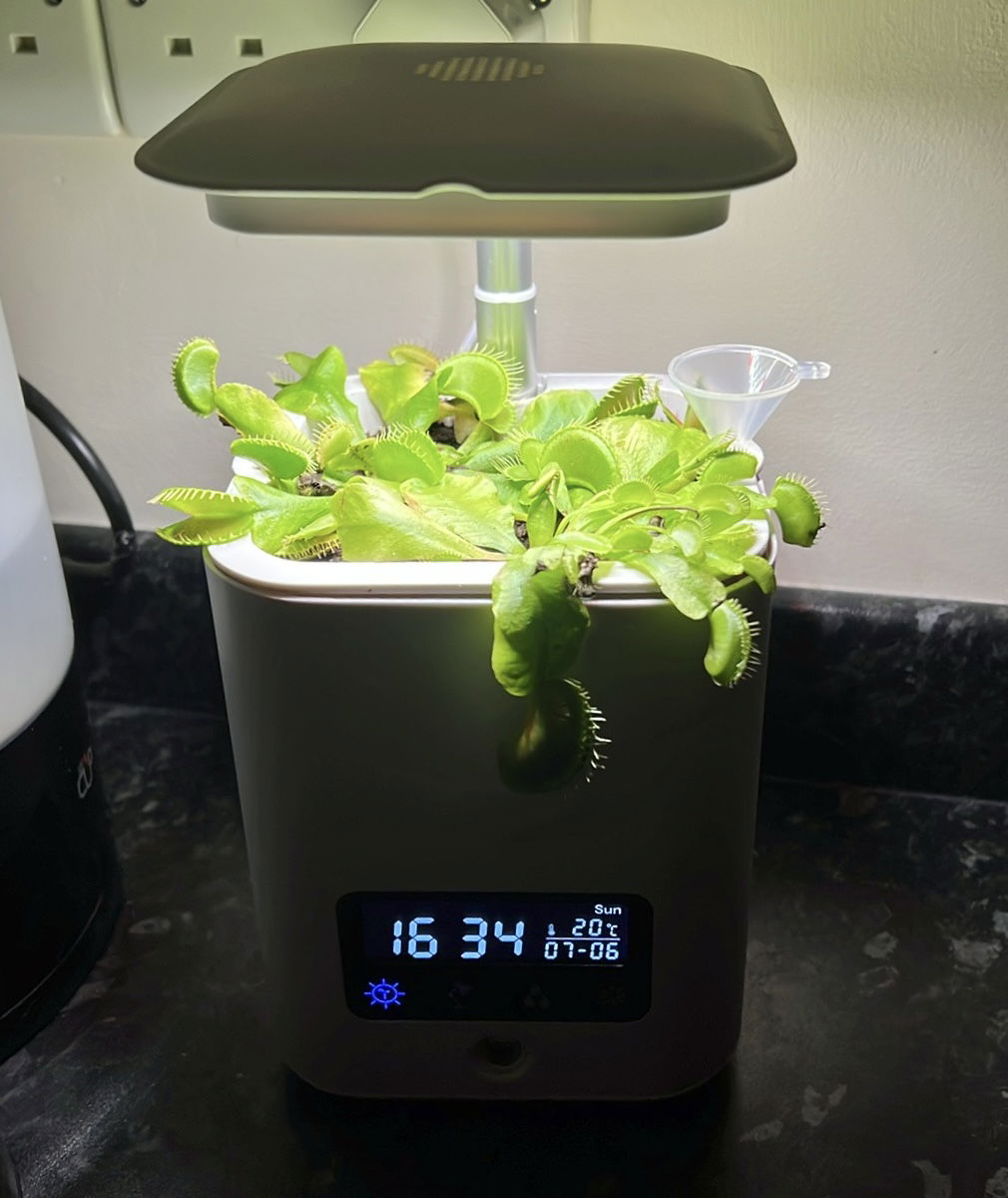 Venus Fly Traps grow exceptionally well under grow-lights. This product above has a self-watering mechanism to complement the plant's need for a constant source of water.