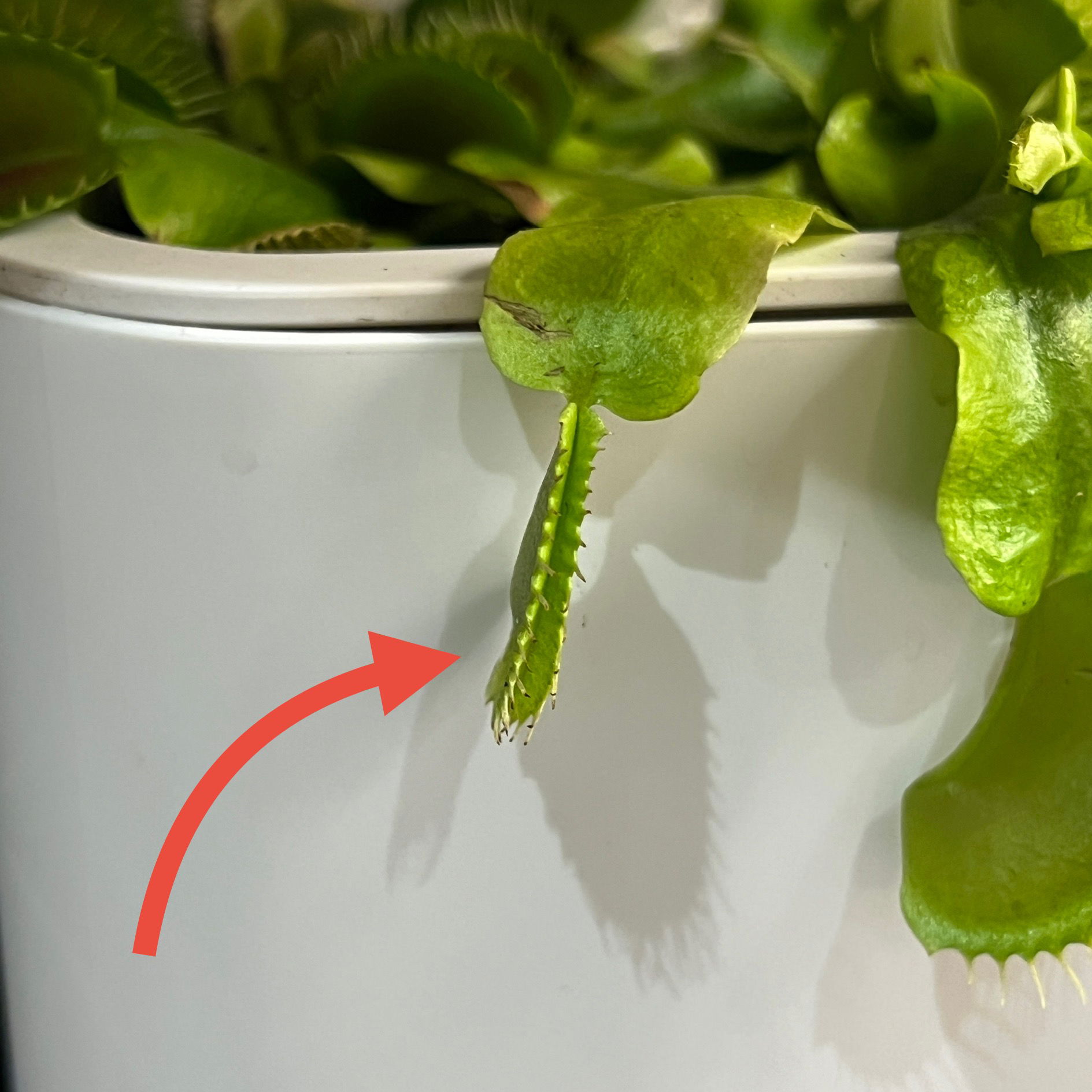 What is this long stem growing from my Venus Fly Trap? Don't panic; these are just its flowers that'll emerge and open up around 30cm above the plant! If you're not too bothered about its blooms, you can cut the stem off around 3cm (1in) above the soil to allow it to conserve energy for leaf production.